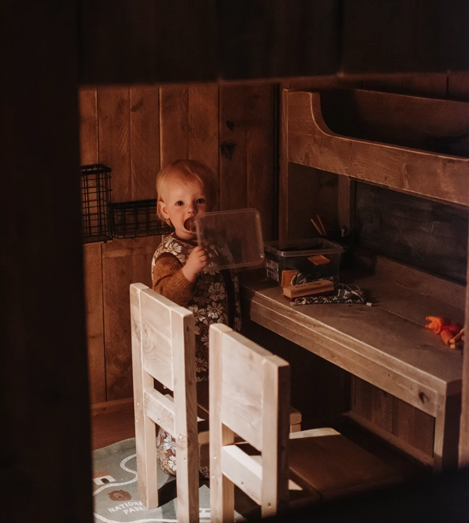 ‘Wij waren er in juni en hadden geluk dat het lekker weer was. Het koelde ’s nachts wel af, maar was goed te doen. Voor koudere nachten lagen er ook kruiken en dekens in de tent. In de koudere maanden zou ik met een jonge baby wel eerder kiezen voor een cabin. ‘s Ochtends als we uit bed kwamen, staken we direct de palletkachel aan. Dat was niet ingewikkeld en maakte de tent gelijk warm. En het was nog knus ook met een vuurtje aan.’