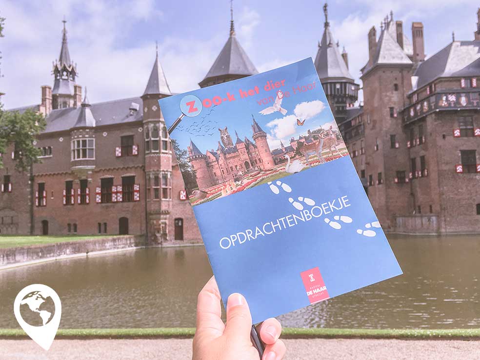 Om het kasteelbezoek voor onze kinderen leuker te maken besluiten we een speurtocht te doen. We vragen bij de kassa welke speurtocht geschikt is voor twee kleuters. De dame achter de balie adviseert ons ‘de Zoo-k het dier van de Haar’. We gaan dieren spotten in het om het kasteel. Leuk!