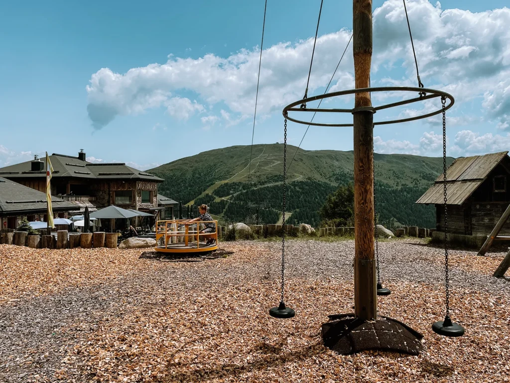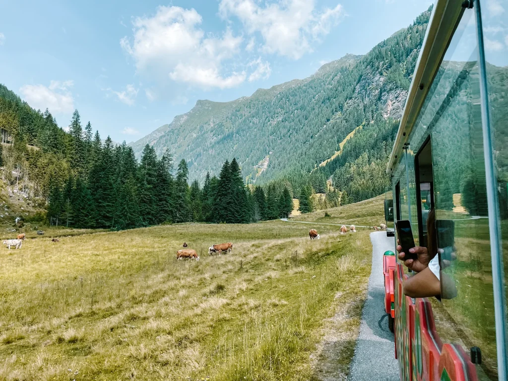 Misschien wel de favoriet in Katschberg van onze kinderen: Het ritje met het elektrische treintje in natuurpark Pöllatal. Wij stapten op in dit kleurrijke pleintje vanaf de parkeerplaats P1 Pöllatal en stapten uit bij het eindstation. De rit is al prachtig. Je rijdt door een glooiend dal met gezellige traditionele huisjes en koeien met bellen. Wij stapten uit bij het eindstation waarna we doorliepen naar de Jausenstation Kochlöffelhütte. Hier aten we op het terras heerlijke apfelstrudel en kaiserschmarren.