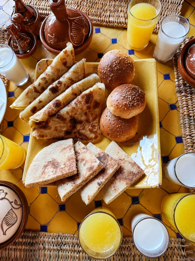 Eten speelt een grote rol in de Marokkaanse cultuur, en het is heerlijk, vooral voor wie van zoet houdt. Elke ochtend begonnen we de dag met een heerlijk ontbijt: pannenkoeken met jam of honing en versgeperste jus d’orange.