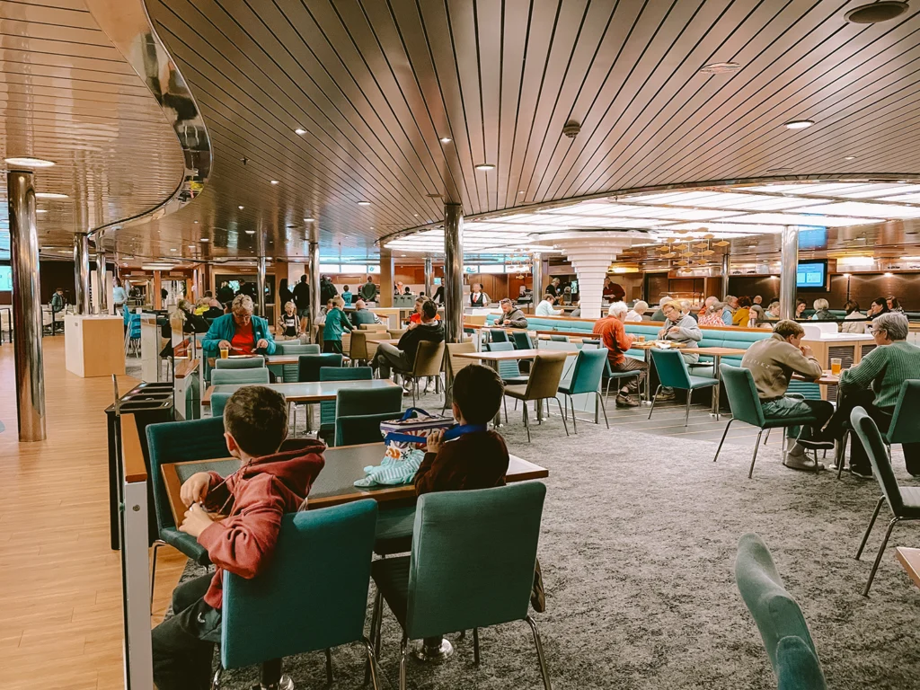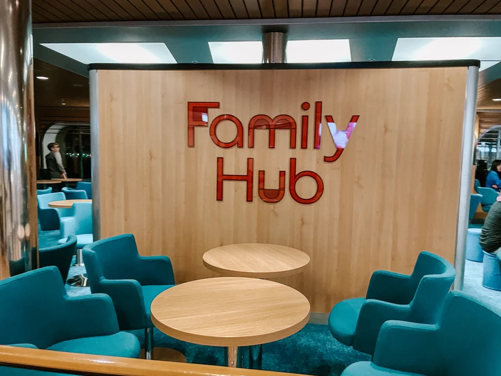 Wij hebben op de boot vooral geslapen, maar er is een lounge met aangrenzend een speelplekje voor kleine kinderen. De Family Hub. Hier staan ook een aantal schermen waar je een film kunt kijken of kunt gamen. Fijn is het dat je als ouder op de stoelen zit waar je zicht hebt op de kinderen. En je kunt er koffie bestellen met wat lekkers of een ijsje halen.