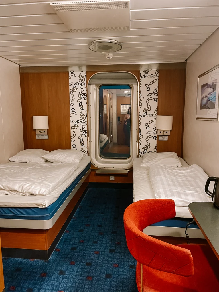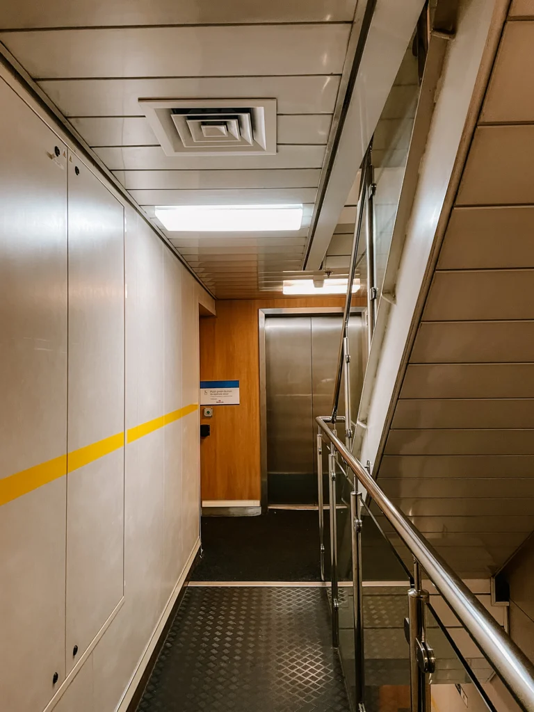 In principe laat je al je spullen in de auto tijdens de vaart en neem je alleen mee wat je nodig hebt om te slapen. Wij hadden een rugzak met onze spullen en een losse tas. Vanaf het autodek loop je naar de liften om naar de hutten te gaan. In de smalle gangen kan het dan wel een beetje druk en rommelig zijn. Zeker omdat iedereen graag snel een lift in wil.