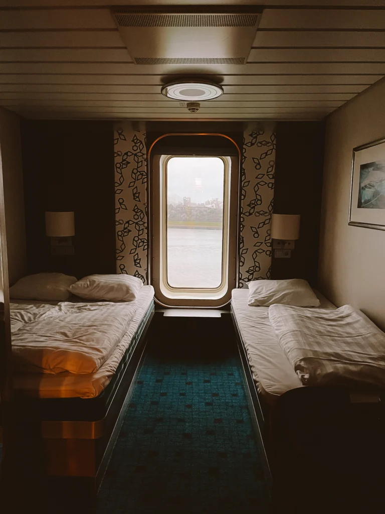 Je hebt ook de keuze tussen een binnen- of een buitenhut. Binnenhutten liggen binnen in het schip en hebben dus geen raam of patrijspoort om naar buiten te kijken. Bij buitenhutten heb je wel een raam. Wij hadden heen een binnenhut en terug een buitenhut. Omdat het al donker was toen we vetrokken en nog schemerig toen we aankwamen, heb ik een raam niet gemist op de heenweg. Ook had ik het idee dat ik in de binnenhut minder merkte van het varen, dat er minder deining was. Maar er zijn ook mensen die zich meer opgesloten voelen zonder raam.
