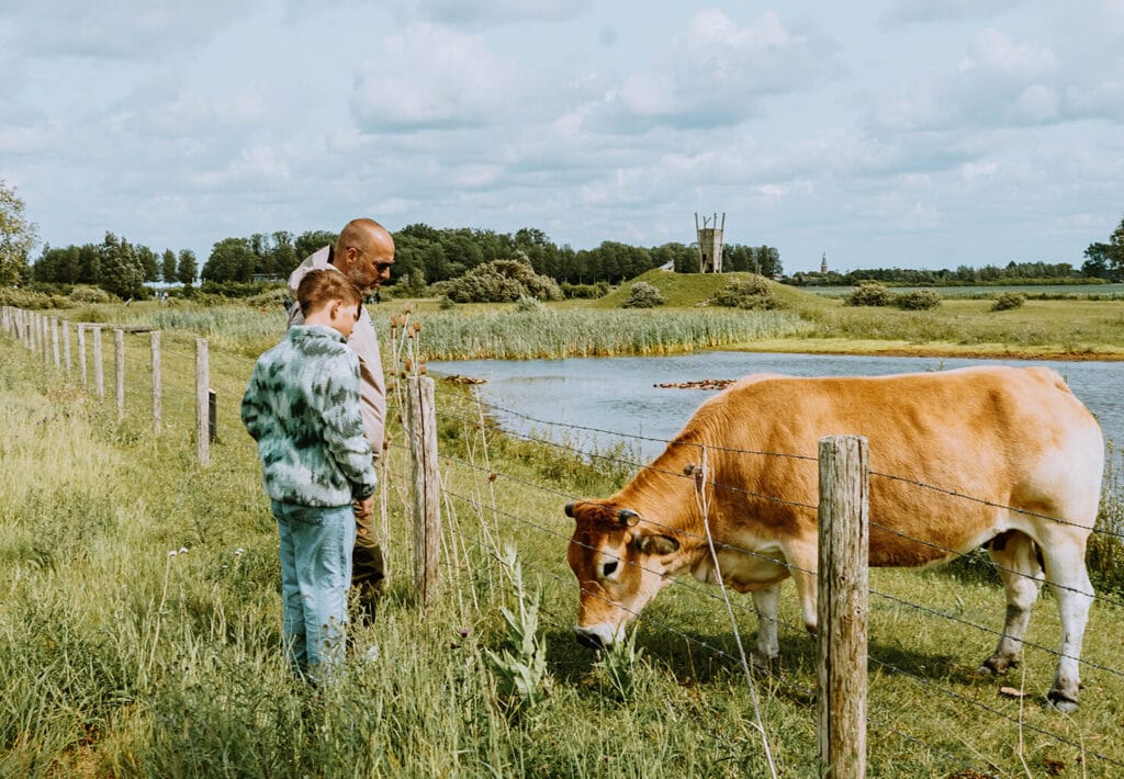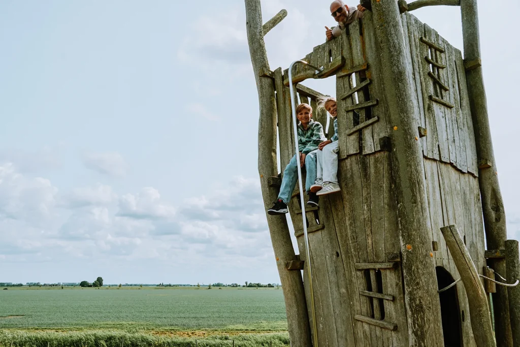 Bij de klimtoren klimmen en klauteren onze kids naar boven en rennen ze over het kleine hindernisparcours. De klimtoren is onderdeel van een wandeling door de Groese Polder en we besluiten nog een stukje verder te lopen door het mooie groene landschap waar koeien en schapen grazen, voordat we terugrijden naar de camping en ons avontuur ten einde komt.