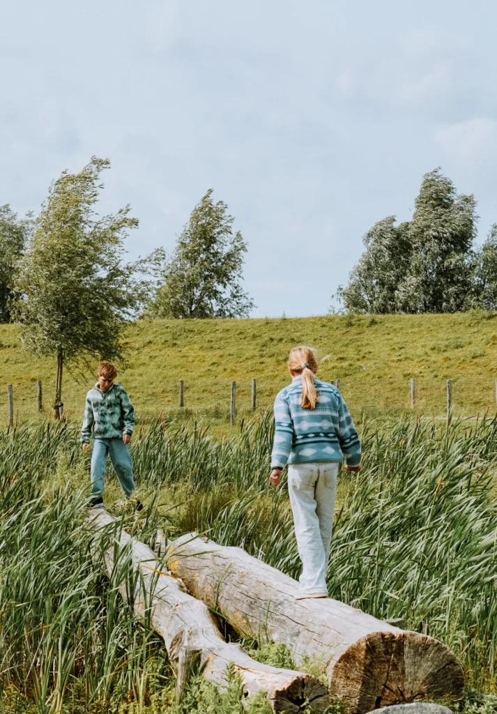 Vanaf de parkeerplaats van Groede Podium zien we in de verte een toffe speeltoren liggen. We besluiten er naartoe te lopen. Het pad is avontuurlijk. We balanceren over enorme boomstammen die een natuurlijke brug vormen over de polderslootjes.