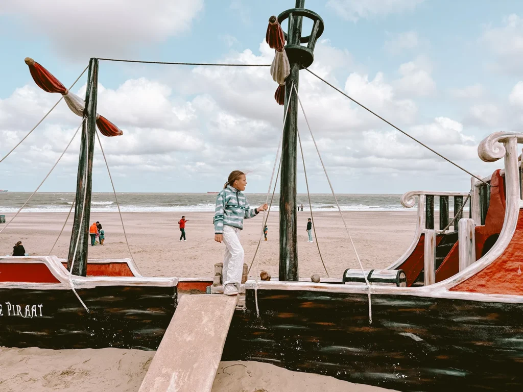 Bij strandtent De Piraat warmen we op met een warme choco en vermaken de kinderen zich met spelen op het houten piratenschip dat op het strand ligt.