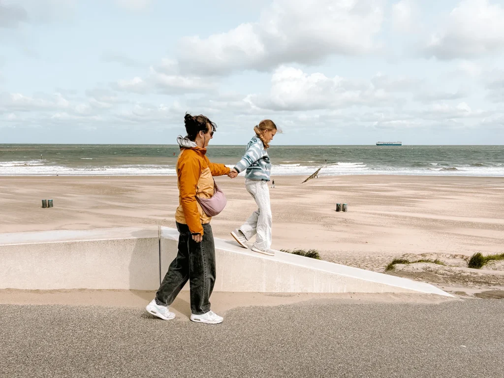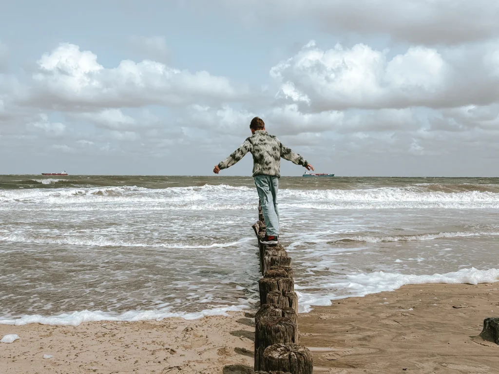 De volgende dag is het onstuimig weer. Het stormt, maar juist dan vinden we het leuk om naar het strand te gaan. We kiezen voor het plaatsje Cadzand-Bad dat op wandelafstand van de camping ligt. De kinderen springen van paal naar paal over de houten paalhoofden terwijl de golven woest het strand op slaan.