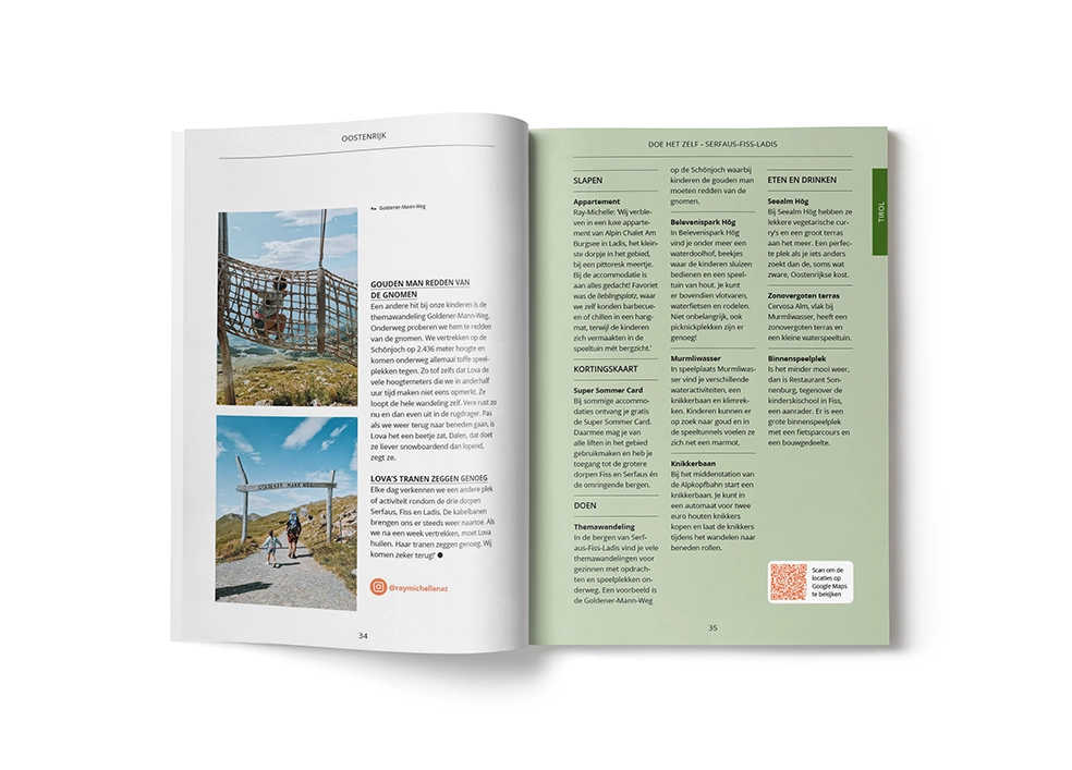 In dit boek vertellen gezinnen die in de Alpenlanden waren over hun vakantie! Zij nemen je mee en delen wat ze ondernamen en ontdekten. Hoe ze met de kinderen gingen wandelen tussen de koeien met rinkelende bellen, bij welke berghut ze de leukste speeltuin vonden en waar ze de lekkerste apfelstrudel aten. Want de beste tips krijg je van gezinnen die er zelf geweest zijn!