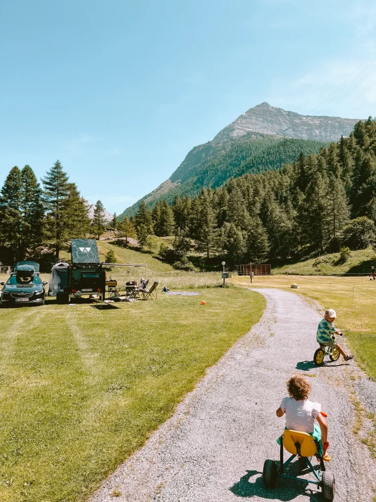 Er is een kleine knuffelboerderij, je kunt er edelstenen opgraven in de speeltuin, een fietsparcours én grote springkussens. Het uitzicht op de omliggende 4000’ers is er adembenemend! Overal waar we kijken zien we de witte bergtoppen en gletsjertongen. Maar de absolute favoriet? De waterspeeltuin! Finn en Rune zijn uren zoet met het bedienen van de sluiszen, de bakken te vullen én met het vlot over het bergmeertje heen en weer te ‘varen’.