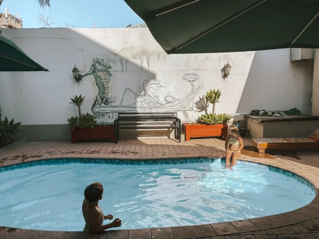 Wij sliepen één nacht in het Turnberry Boutique Hotel. De kamers zijn wat verouderd en het hotel zelf is niet heel bijzonder. Het kleine zwembad, met dubieuze muurschildering, zorgt voor verkoeling. De locatie van het hotel is fijn. We wandelen zo het centrum in waar we boodschappen kunnen doen en fijne restaurantjes vinden.